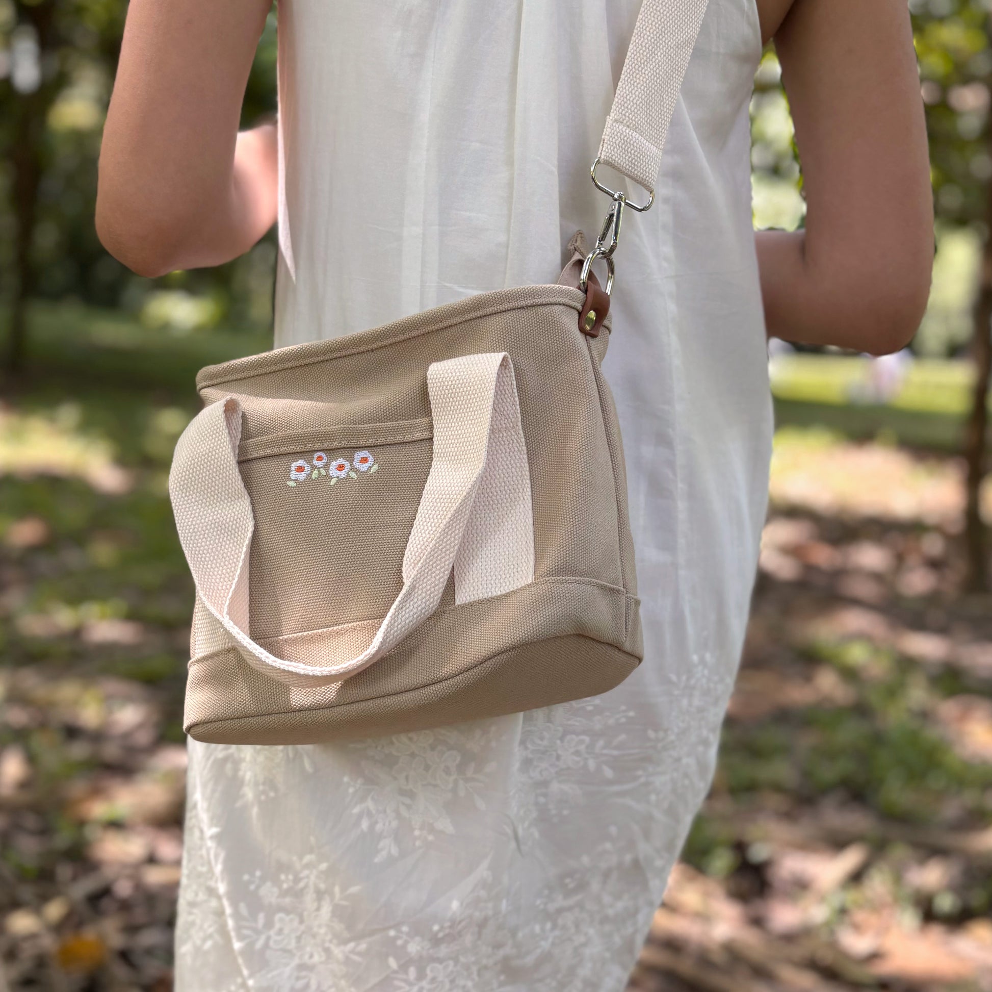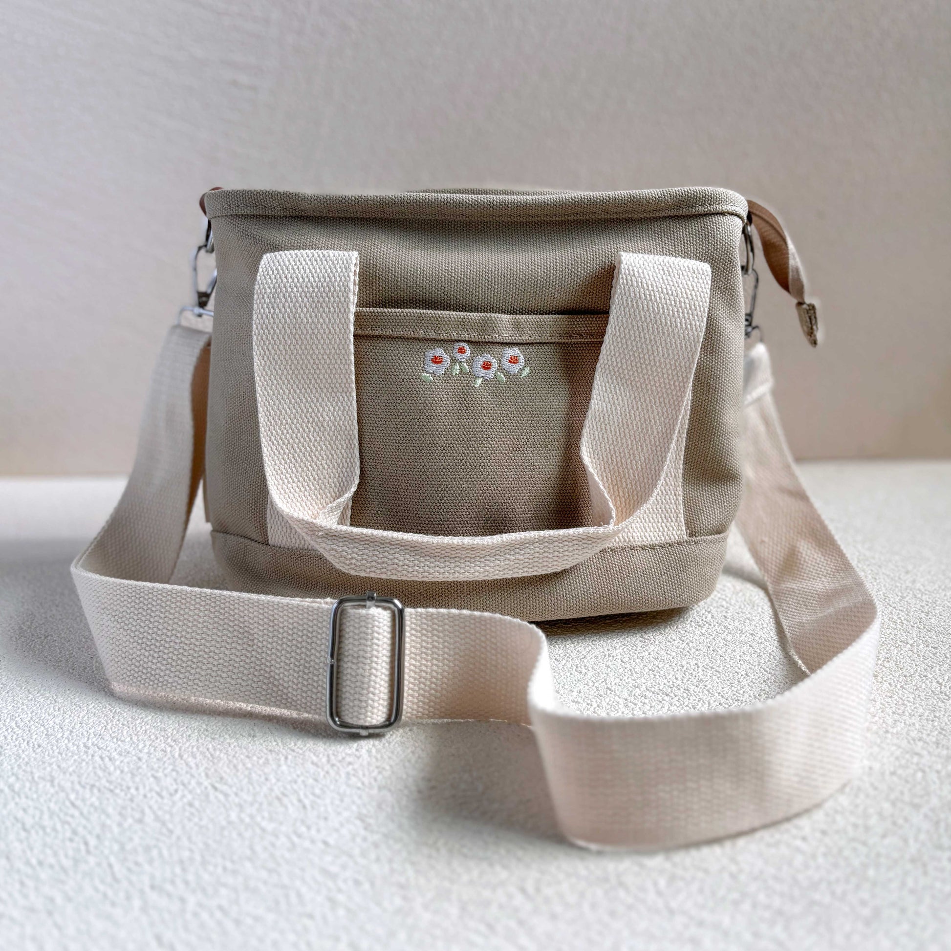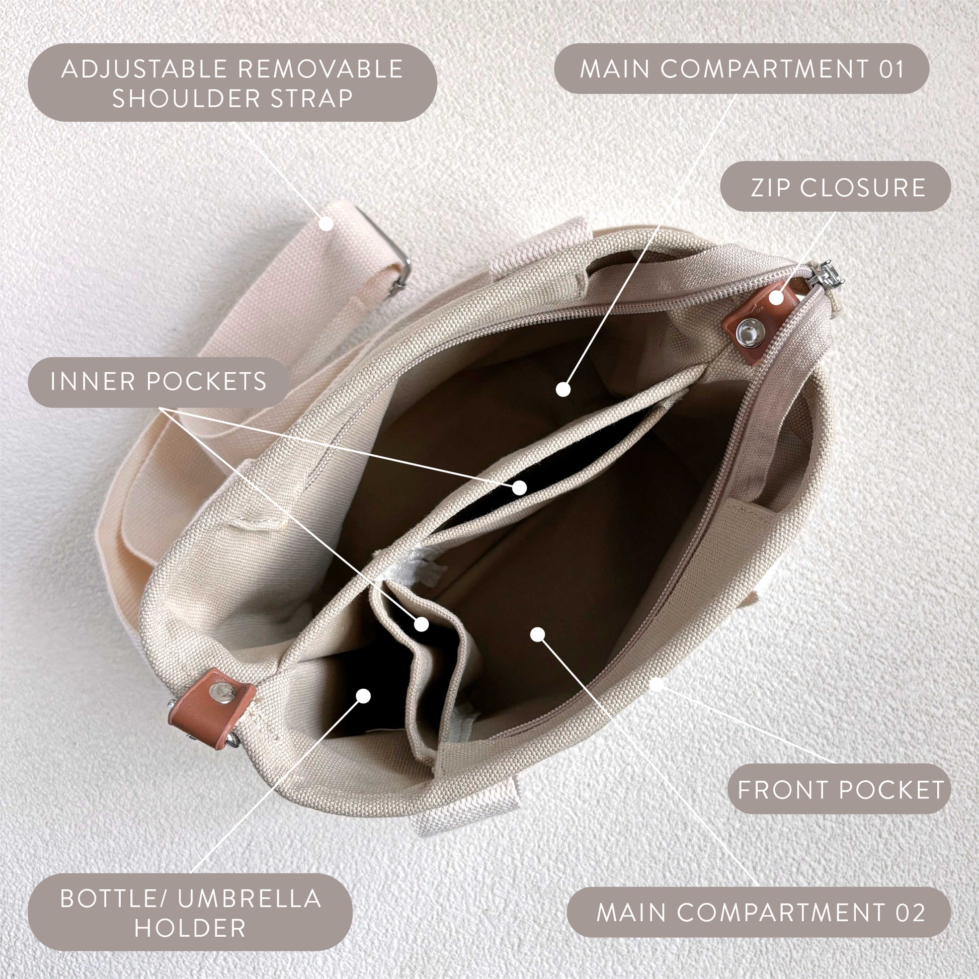Organization meets elegance in our Florette Mini Multi-compartment Tote. Petite yet spacious, this khaki-toned bag is designed with a built-in organiser that keeps your belongings neat and easily accessible, and crafted with a durable canvas material.