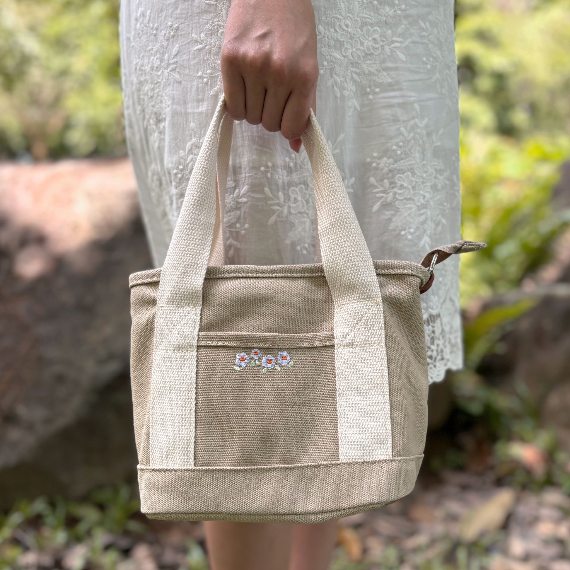 Dainty, embroidered floral motifs adorn the rim of the external pocket, framing a window where you can personalise your Florette Mini Tote with our range of enamel pins & patches or patterned shoulder straps (not included).